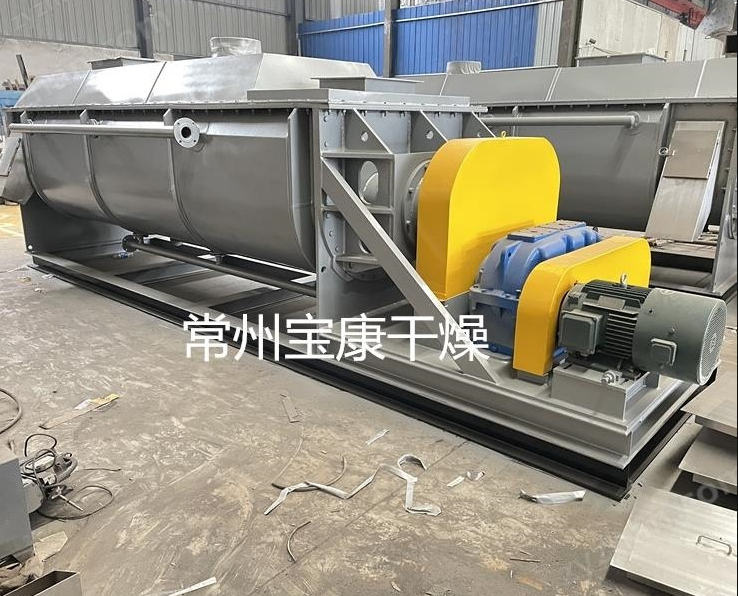 二、主要結(jié)構(gòu)組成 設(shè)備結(jié)構(gòu)圍繞傳熱效率與物料處理需求設(shè)計(jì),核心部件分類如下: 1. 主體傳熱結(jié)構(gòu) •W 型夾套殼體:端面呈 W 型,內(nèi)壁接觸物料,外部夾套通熱介質(zhì)形成傳熱面。該結(jié)構(gòu)擴(kuò)大傳熱面積、引導(dǎo)物料流動(dòng),減少滯留死角;殼體頂部設(shè)密封上蓋,兩端配端蓋,可防粉塵外泄、收集揮發(fā)氣體,便于尾氣處理。 •空心槳葉軸:通常設(shè) 2-4 根,軸體空心,表面焊楔形中空槳葉,二者均為傳熱核心。熱介質(zhì)經(jīng)軸端旋轉(zhuǎn)接頭進(jìn)入軸與槳葉,通過槳葉表面?zhèn)鳠?;部分槳葉底部有刮板,可刮起殼底物料,提升熱交換均勻性;軸數(shù)量與槳葉排布依處理量和物料特性設(shè)計(jì),多軸增強(qiáng)攪拌與自清潔效果。 2. 驅(qū)動(dòng)與連接結(jié)構(gòu) •傳動(dòng)系統(tǒng):由電動(dòng)機(jī)、減速機(jī)、齒輪或鏈輪組成,驅(qū)動(dòng)空心槳葉軸低速旋轉(zhuǎn)(10-40 轉(zhuǎn) / 分)。低速運(yùn)轉(zhuǎn)保證物料充分混合,同時(shí)減少設(shè)備磨損、降低能耗。 •旋轉(zhuǎn)接頭:安裝在空心槳葉軸兩端,是熱介質(zhì)進(jìn)出的關(guān)鍵部件??蓪?shí)現(xiàn)固定管路與旋轉(zhuǎn)軸體的密封連接,確保熱介質(zhì)穩(wěn)定輸送、避免泄漏。 3. 物料輸送與控制結(jié)構(gòu) •進(jìn)料與排料裝置:進(jìn)料口連螺旋送料機(jī),實(shí)現(xiàn)定量連續(xù)供料;出料口設(shè)調(diào)節(jié)擋板,通過控制料位保障傳熱效率;部分設(shè)備在進(jìn)料、干燥、排料區(qū)配輔助機(jī)構(gòu),優(yōu)化輸送節(jié)奏。 •輔助控制部件:含溫度傳感器、料位計(jì)等監(jiān)測(cè)元件,實(shí)時(shí)反饋熱介質(zhì)溫度、殼體內(nèi)料位等參數(shù),配合控制系統(tǒng)調(diào)節(jié)加料速度、轉(zhuǎn)速及熱介質(zhì)流量,保證干燥穩(wěn)定;殼體外部包保溫層,減少熱量散失、降低能耗。 |